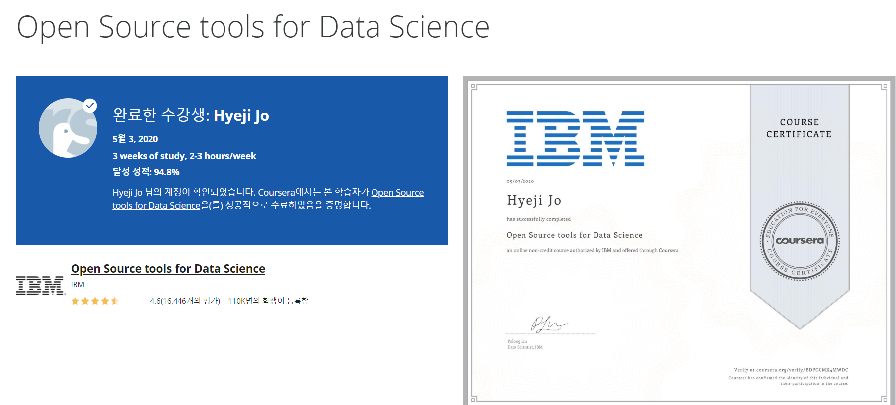 우선 2020년 03월 달에 존스홉킨스 대학의 데이터과학 수업을 들어봤었는데요,