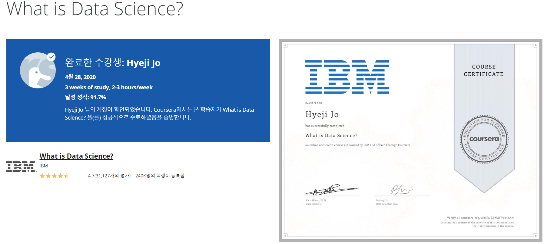 What is Data Science에 대한 수료증을 얻을 수 있었습니다.