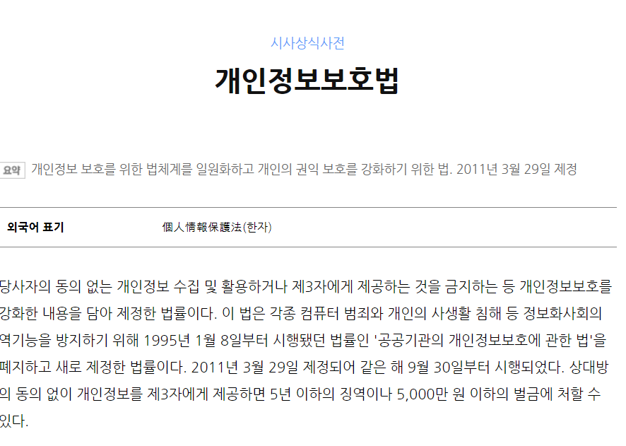 개인정보 보호를 위한 법체계를 일원화하고 개인의 권익 보호를 강화하기 위한 법. 2011년 3월 29일 제정. | 외국어 표기 | 個人情報保護法(한자) | 당사자의 동의 없는 개인정보 수집 및 활용하거��